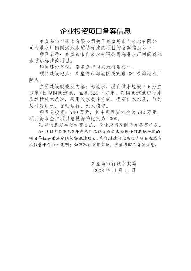 170431___企业投资项目备案信息-秦皇岛市自来水有限公司海港水厂四阀滤池水质达标技改项目.docx