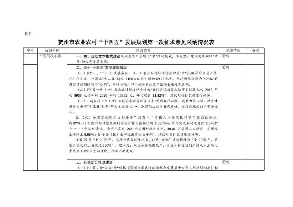 贺州市农业农村“十四五”发展规划第一次征求意见采纳情况表.docx