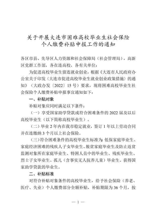 关于开展大连市困难高校毕业生社会保险个人缴费补贴申报工作的通知.doc