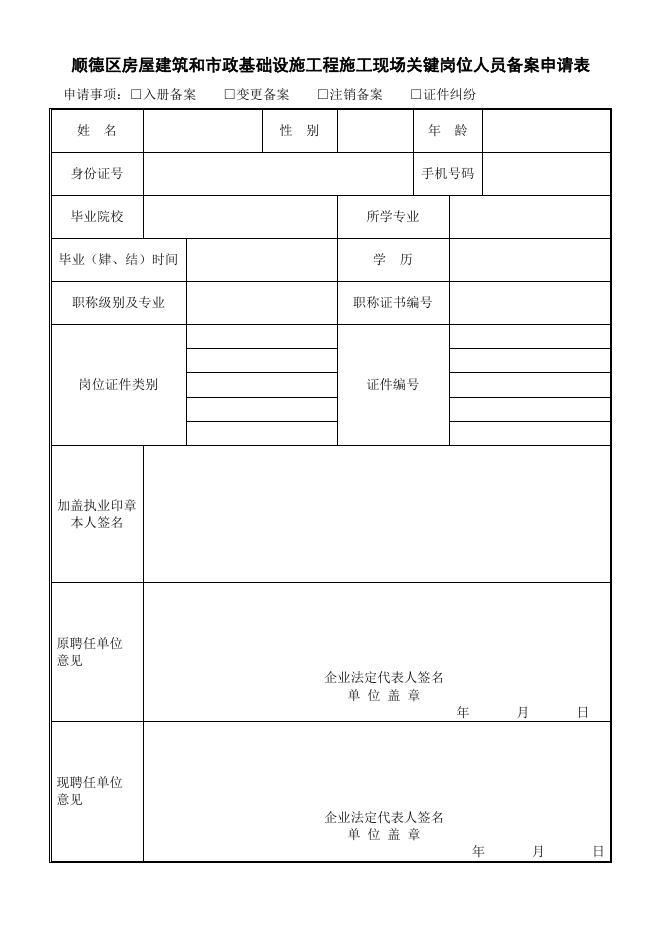 顺德区房屋建筑和市政基础设施工程施工现场关键岗位人员备案申请表.doc