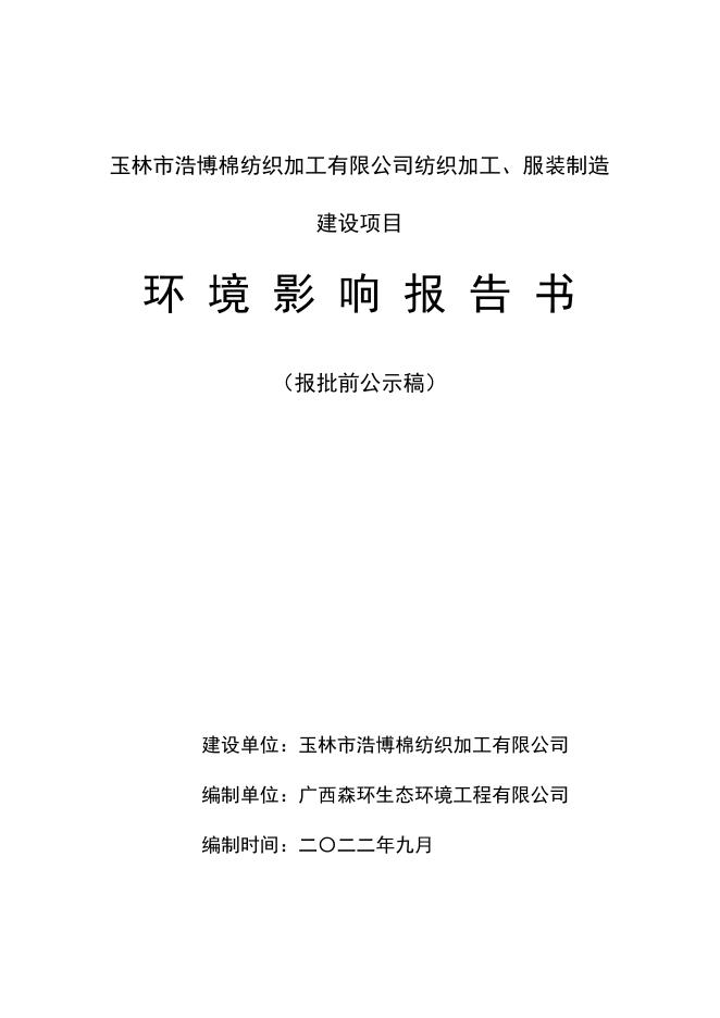 玉林市浩博棉纺织加工有限公司纺织加工、服装制造建设项目环境影响报告书(报批前公示稿).pdf