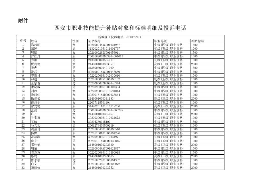 西安市职业技能提升补贴对象和标准明细及投诉电话.xls