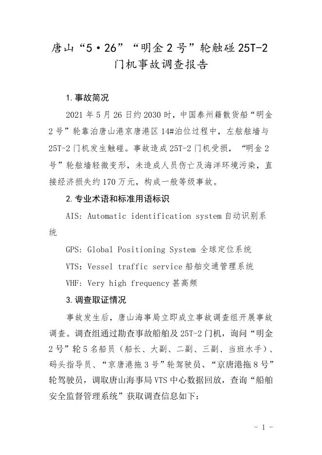 附件:唐山“5·26”“明金2号”轮触碰 25T-2门机事故调查报告(终稿) (公示).doc