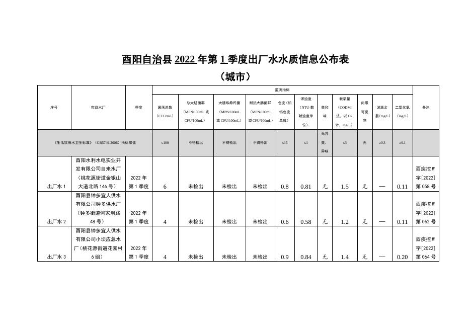 酉阳自治县2022年第1季度水龙头水质监测水质报告.docx