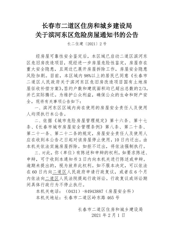附件3长春市二道区住房和城乡建设局关于滨河东区危险房屋通知书的公告.doc