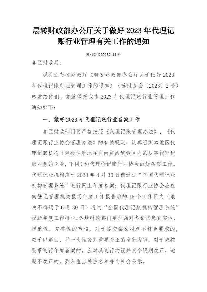 层转财政部办公厅关于做好2023年代理记账行业管理工作的通知(网站).docx