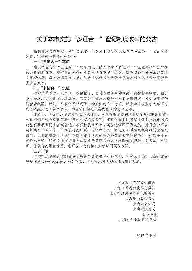 关于本市实施“多证合一”登记制度改革的公告.doc