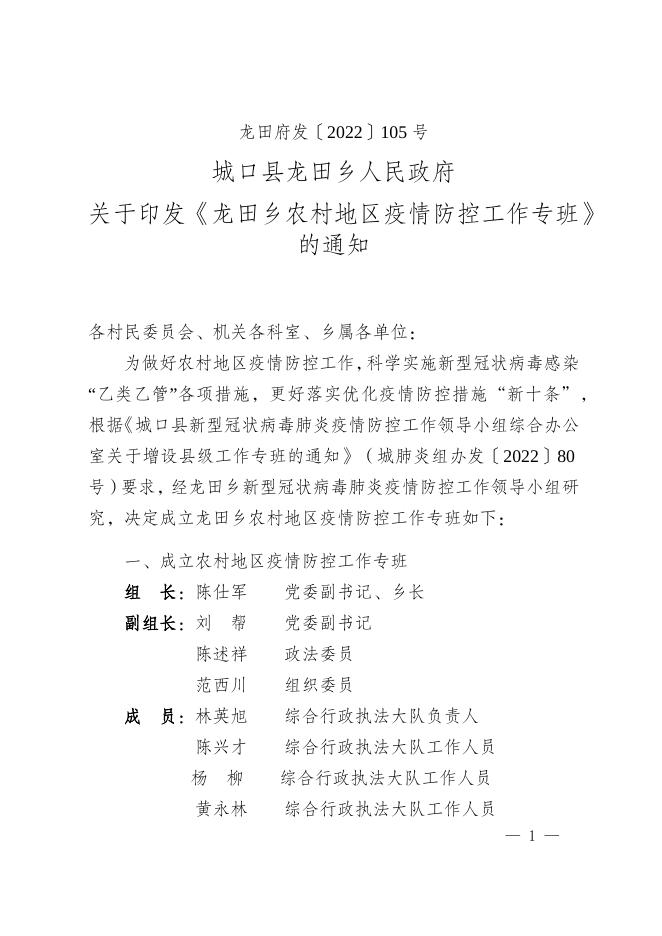 龙田府发〔2022〕105号关于印发《龙田乡农村地区疫情防控工作专班》的通知.docx