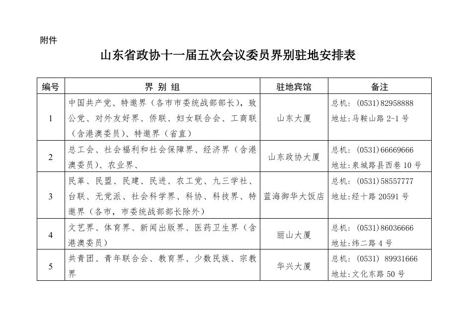 山东省政协十一届五次会议委员界别驻地安排表.doc