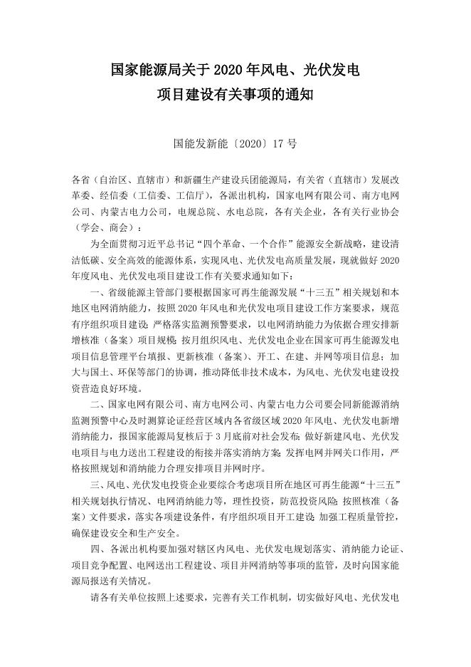 国家能源局关于2020年风电、光伏发电项目建设有关事项的通知.docx