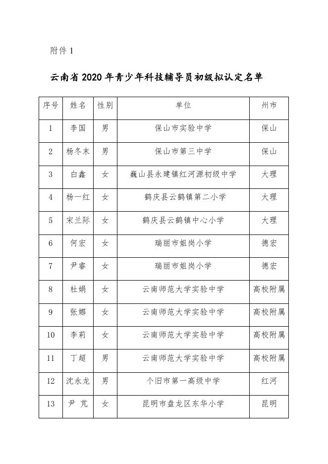 1.云南省2020年青少年科技辅导员初级拟认定名单.docx