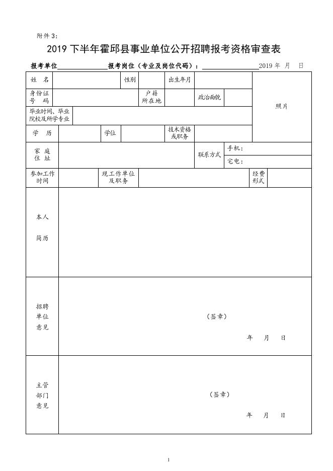 3.2019下半年霍邱县事业单位公开招聘报考资格审查表和诚信承诺书.doc.docx