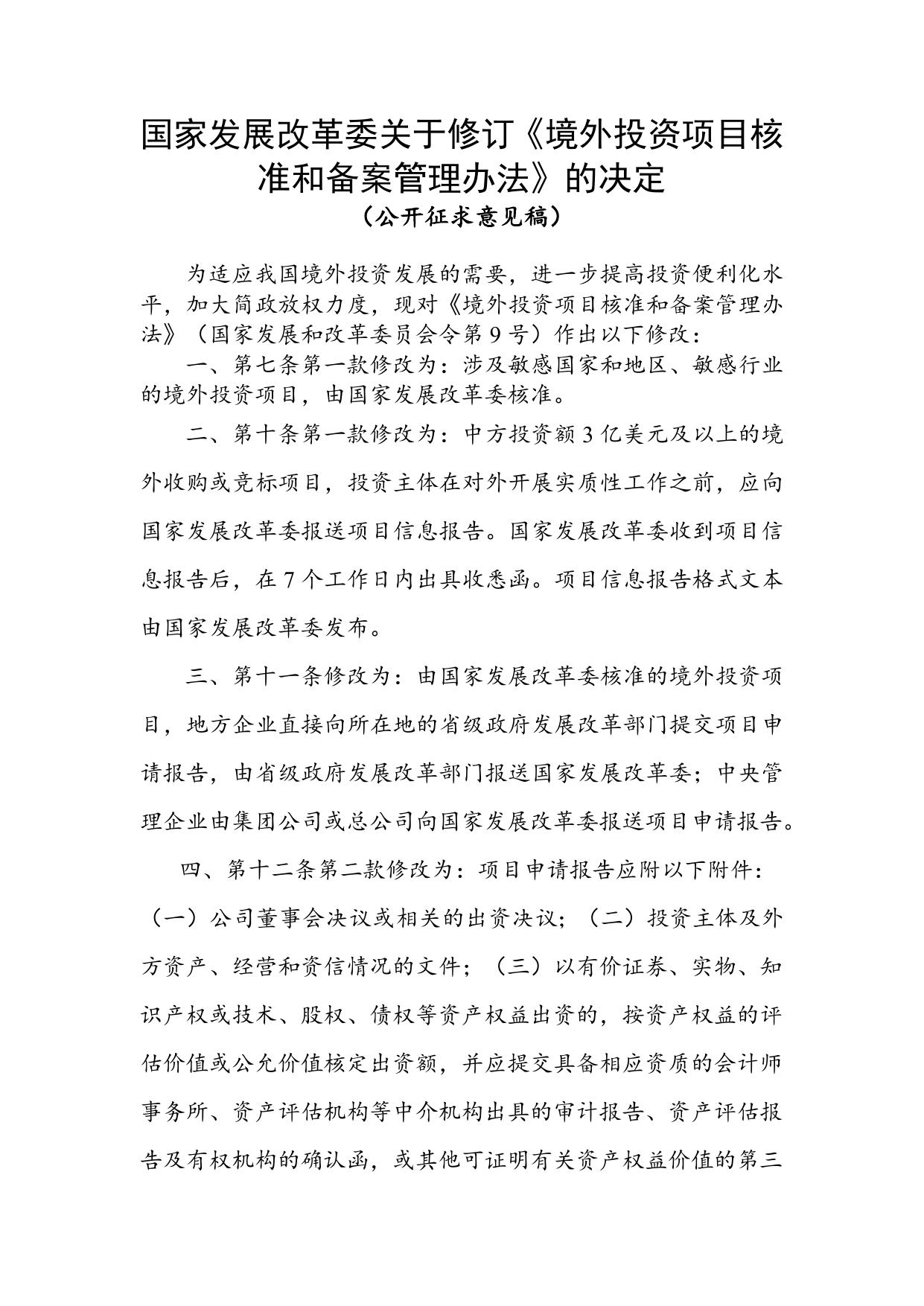 國家發展改革委關於修訂《境外投資項目核準和備案管理辦法》的決定(公開徵求意見稿).doc
