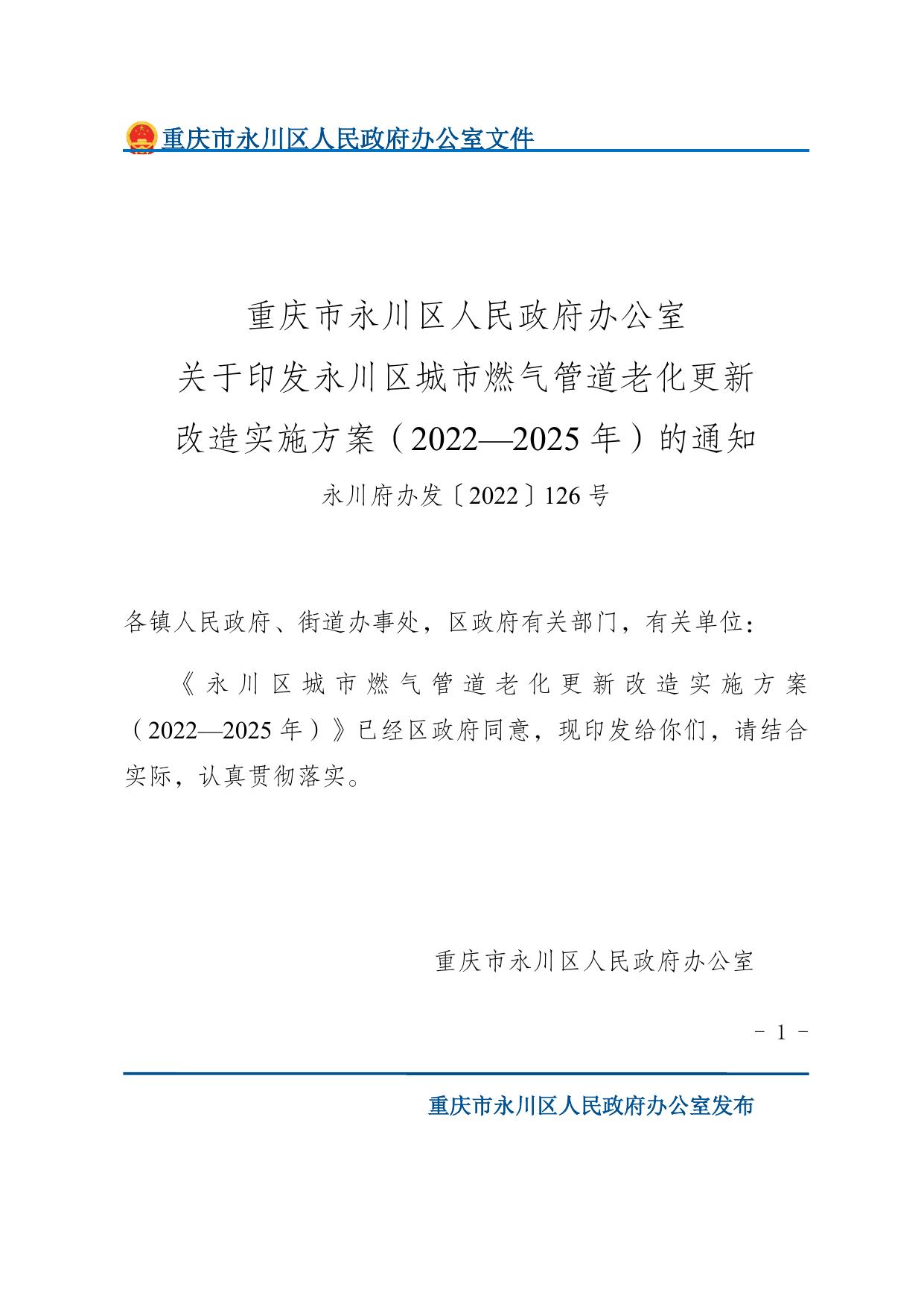 重庆市永川区人民政府办公室关于印发永川区城市燃气管道老化更新改造实施方案(2022—2025年)的通知.docx