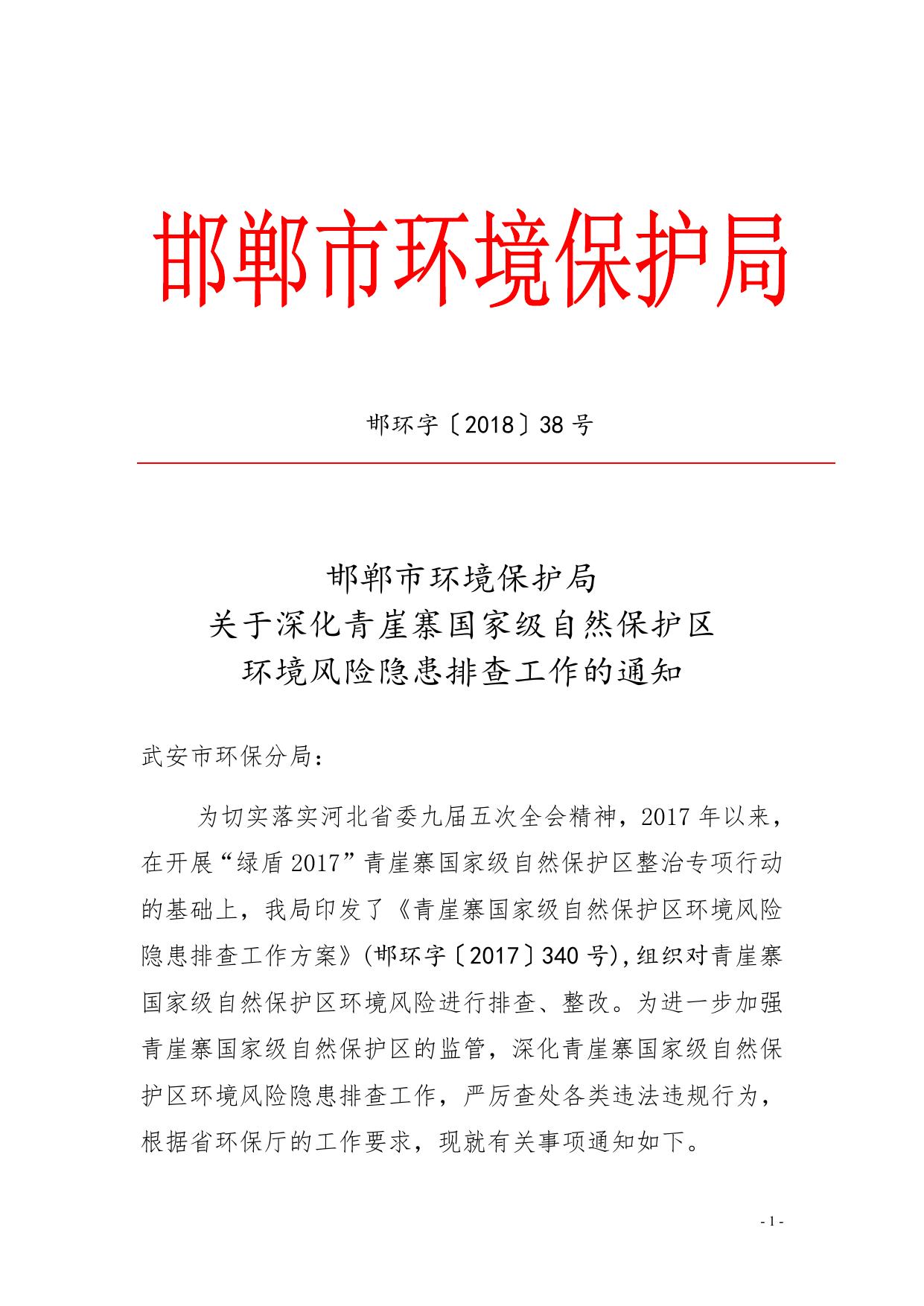 关于深化青崖寨国家级自然保护区环境风险隐患排查工作的通知.doc