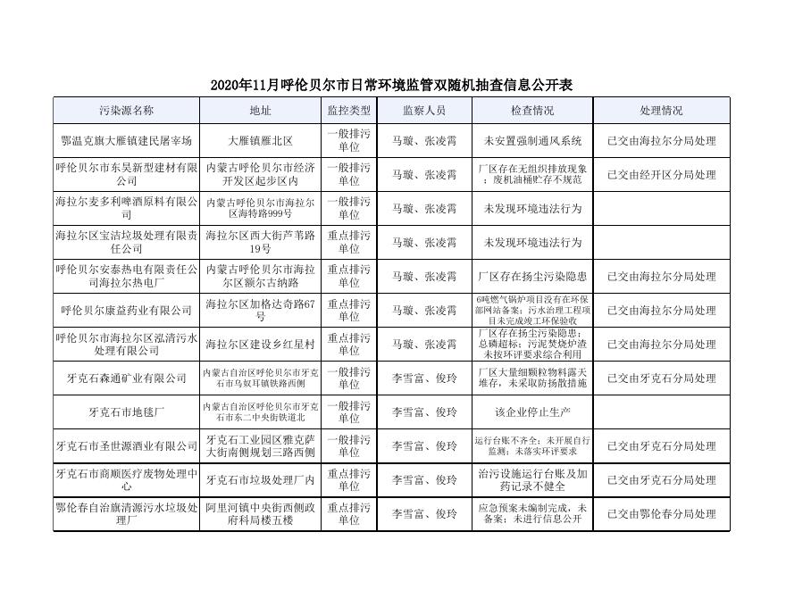 2020年11月呼伦贝尔市日常环境监管双随机抽查信息公开表.xls