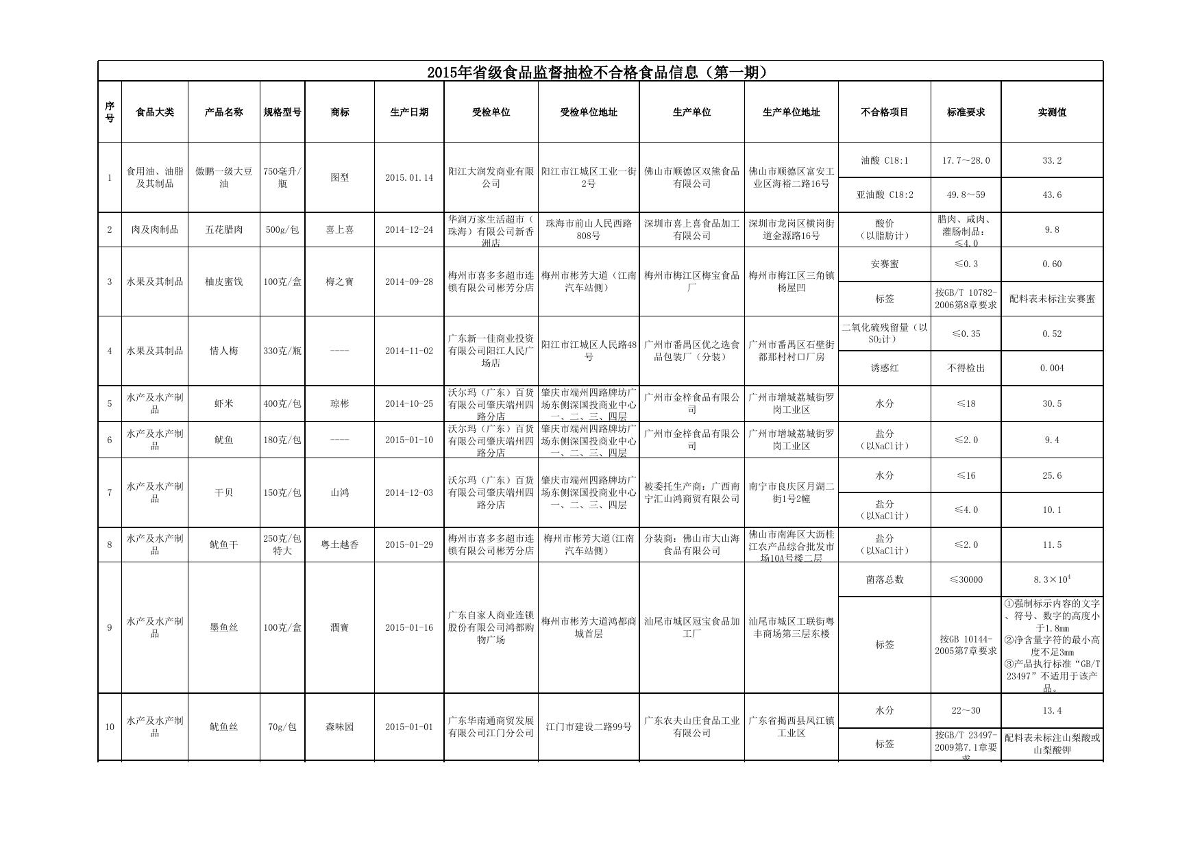 2015年省级食品监督抽检不合格食品信息(第一期).xls