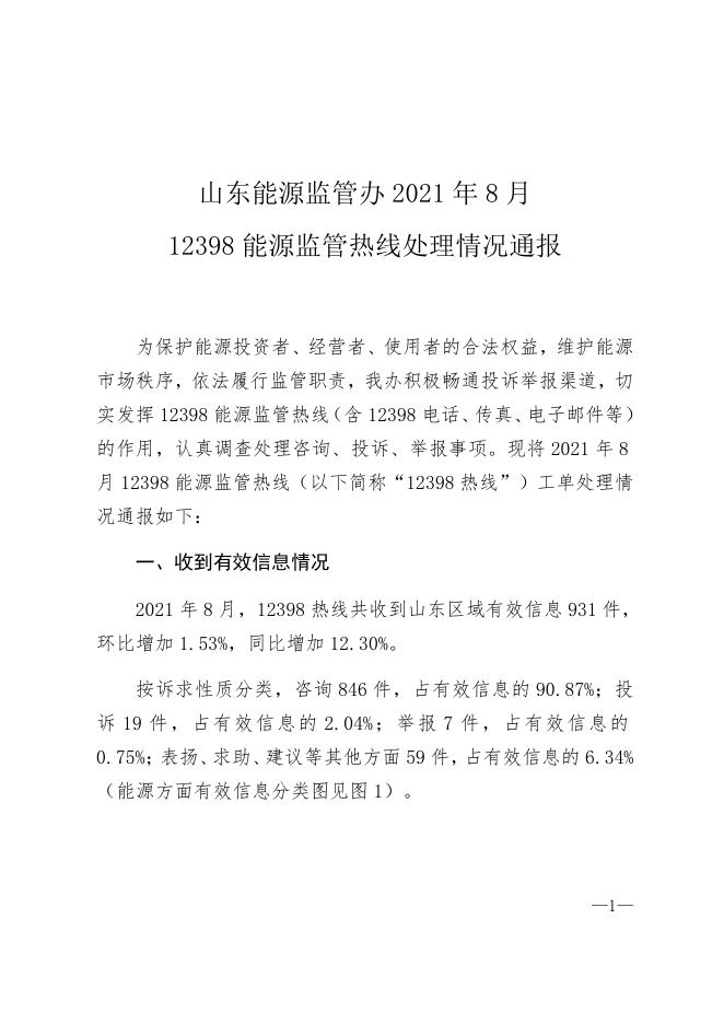 山东能源监管办2021年8月12398能源监管热线投诉举报处理情况通报_处理情况通报_12398热线_互动回应_国家能源局山东监管办公室.docx