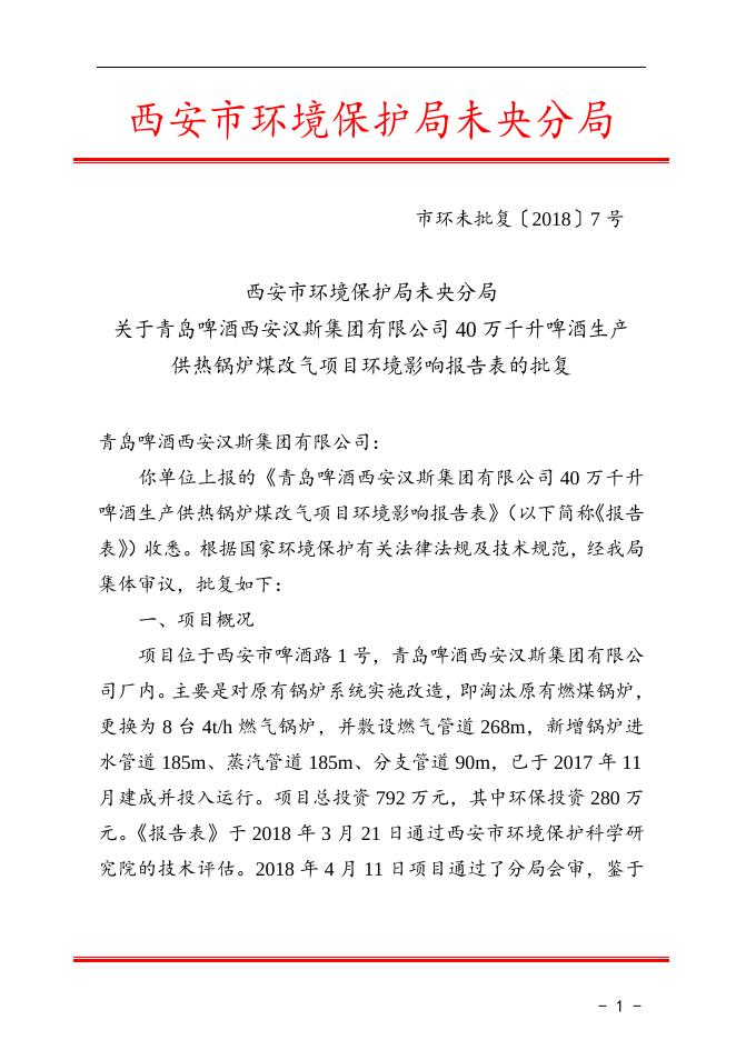市环未批复〔2018〕7号40万千升啤酒生产供热锅炉煤改气项目环境影响报告表审批批复.doc