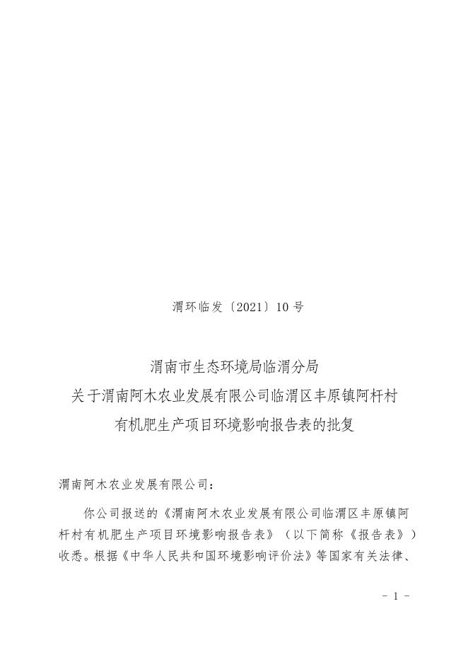 关于临渭区丰原镇阿杆村有机肥生产项目环境影响报告表的批复.docx
