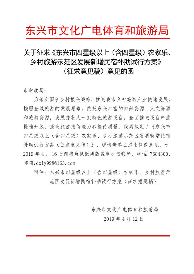 关于征求《东兴市四星级以上(含四星级)农家乐、乡村旅游示范区发展新增民宿补助试行方案》 (征求意见稿)意见的函.doc