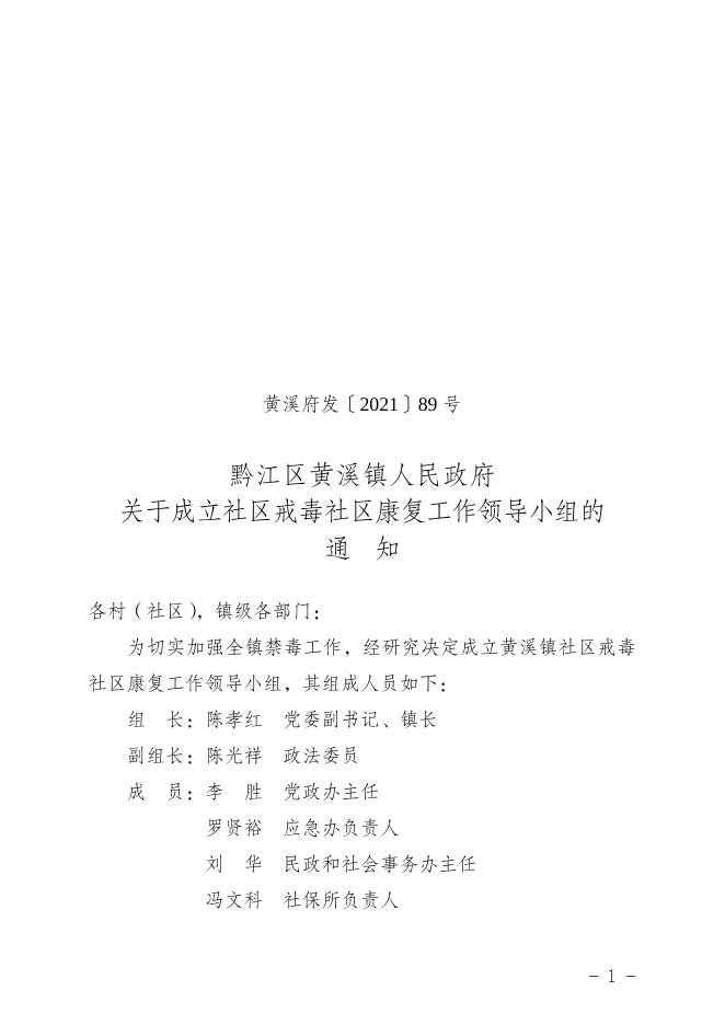 黔江区黄溪镇人民政府关于成立社区戒毒社区康复工作领导小组的通知.doc