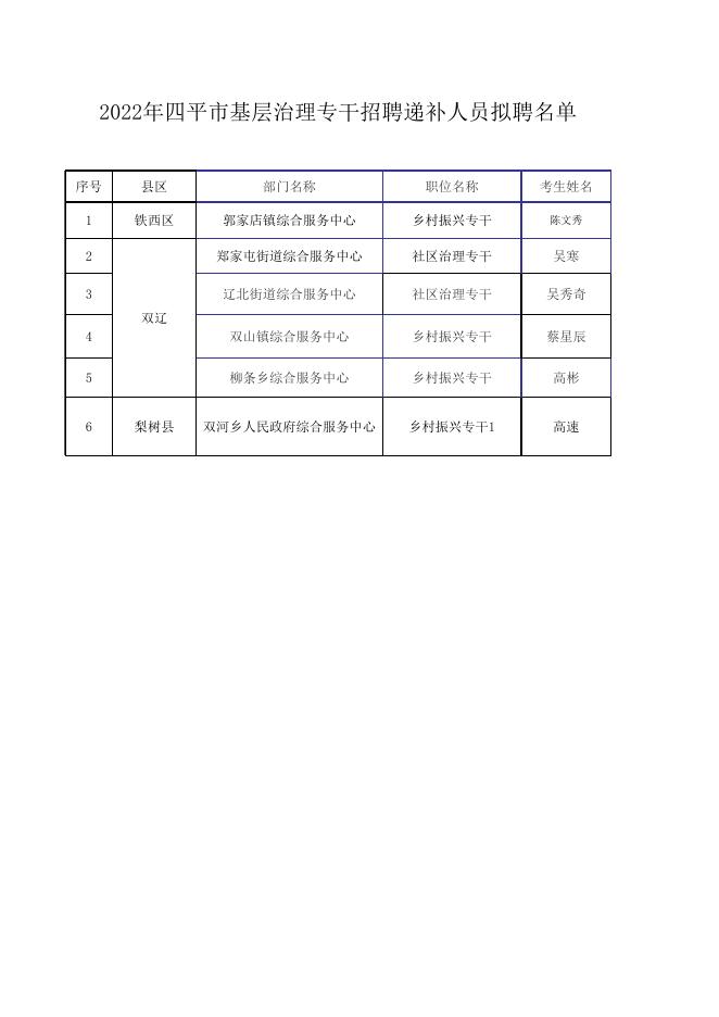 附:《2022年四平市基层治理专干招聘递补人员拟聘名单》.xlsx