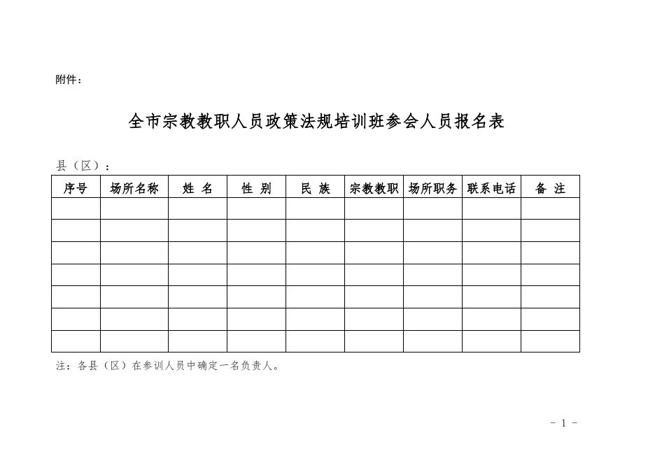 全市宗教教职人员政策法规培训班参会人员报名表.doc