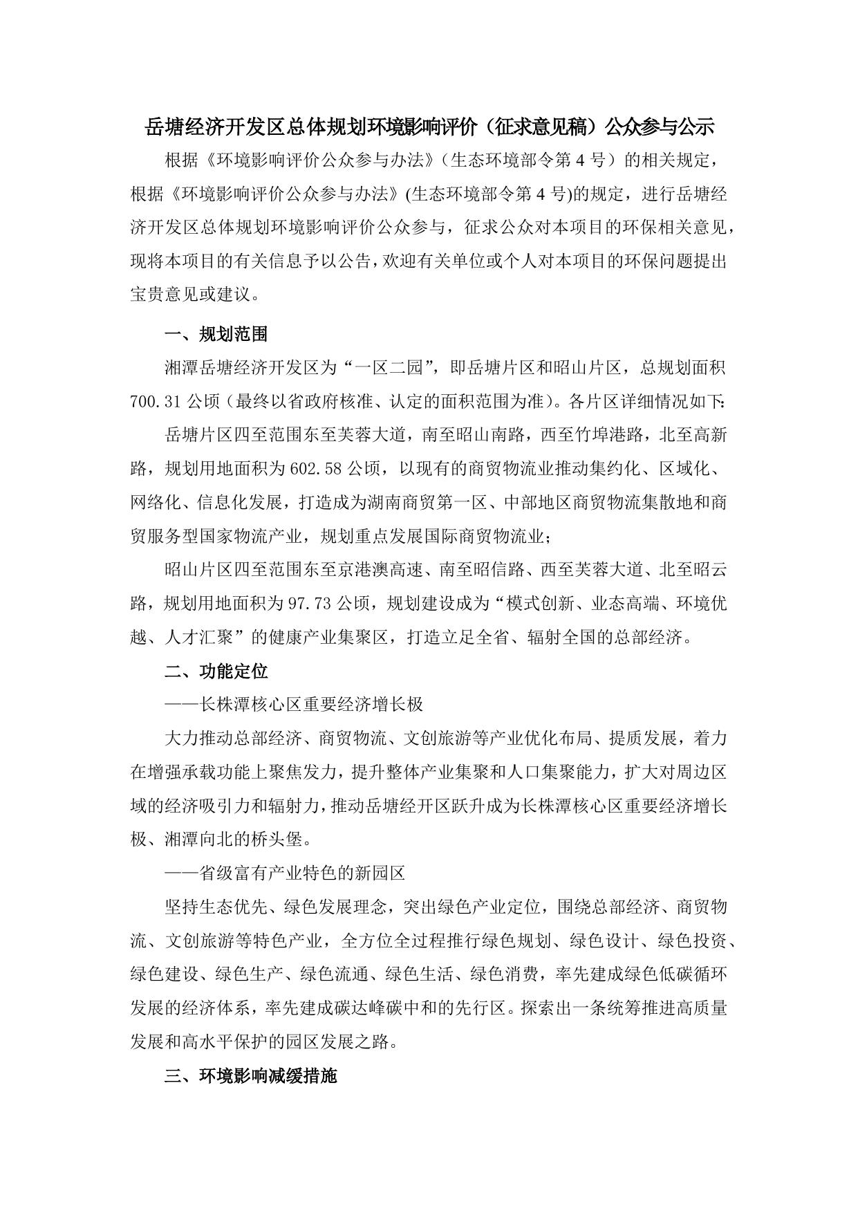 岳塘经济开发区总体规划环境影响评价(征求意见稿)公众参与公示.docx