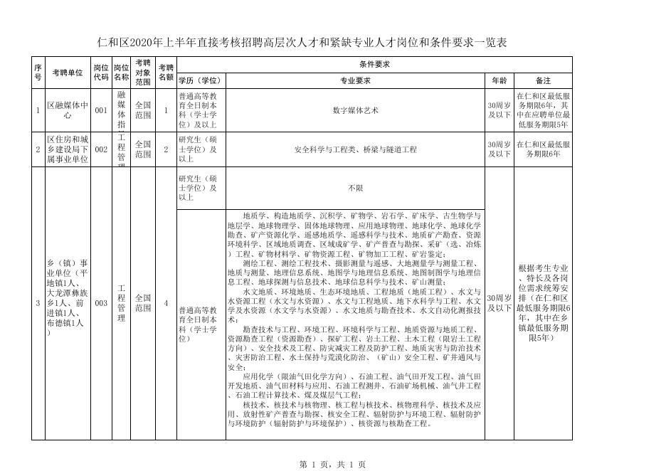 1.攀枝花市仁和区2020年上半年直接考核招聘高层次人才及紧缺专业人才岗位和条件要求一览表.xls