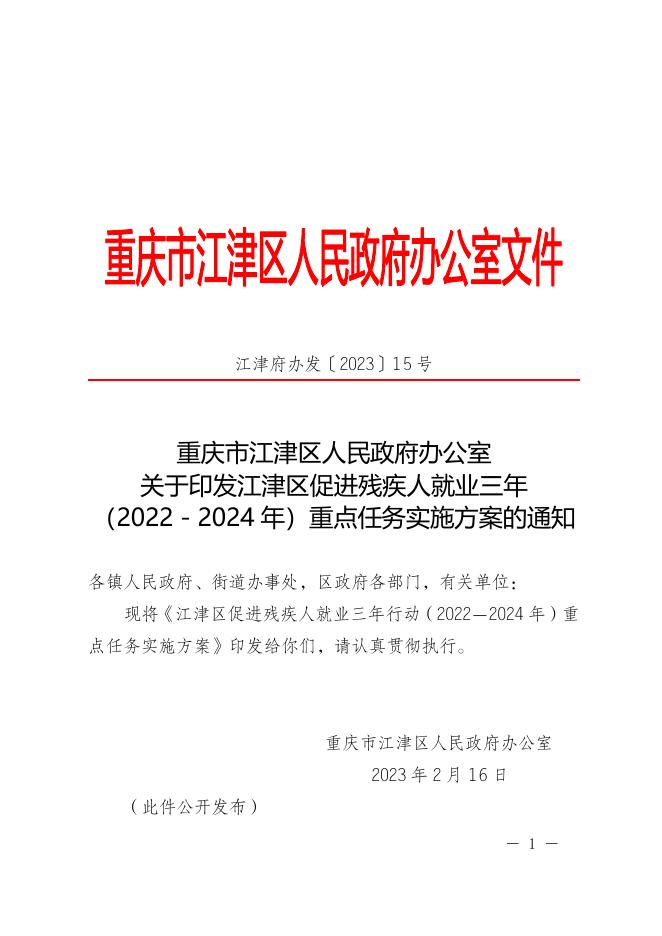 江津府办发〔2023〕15号关于印发江津区促进残疾人就业三年(2022-2024年)重点任务实施方案的通知.doc