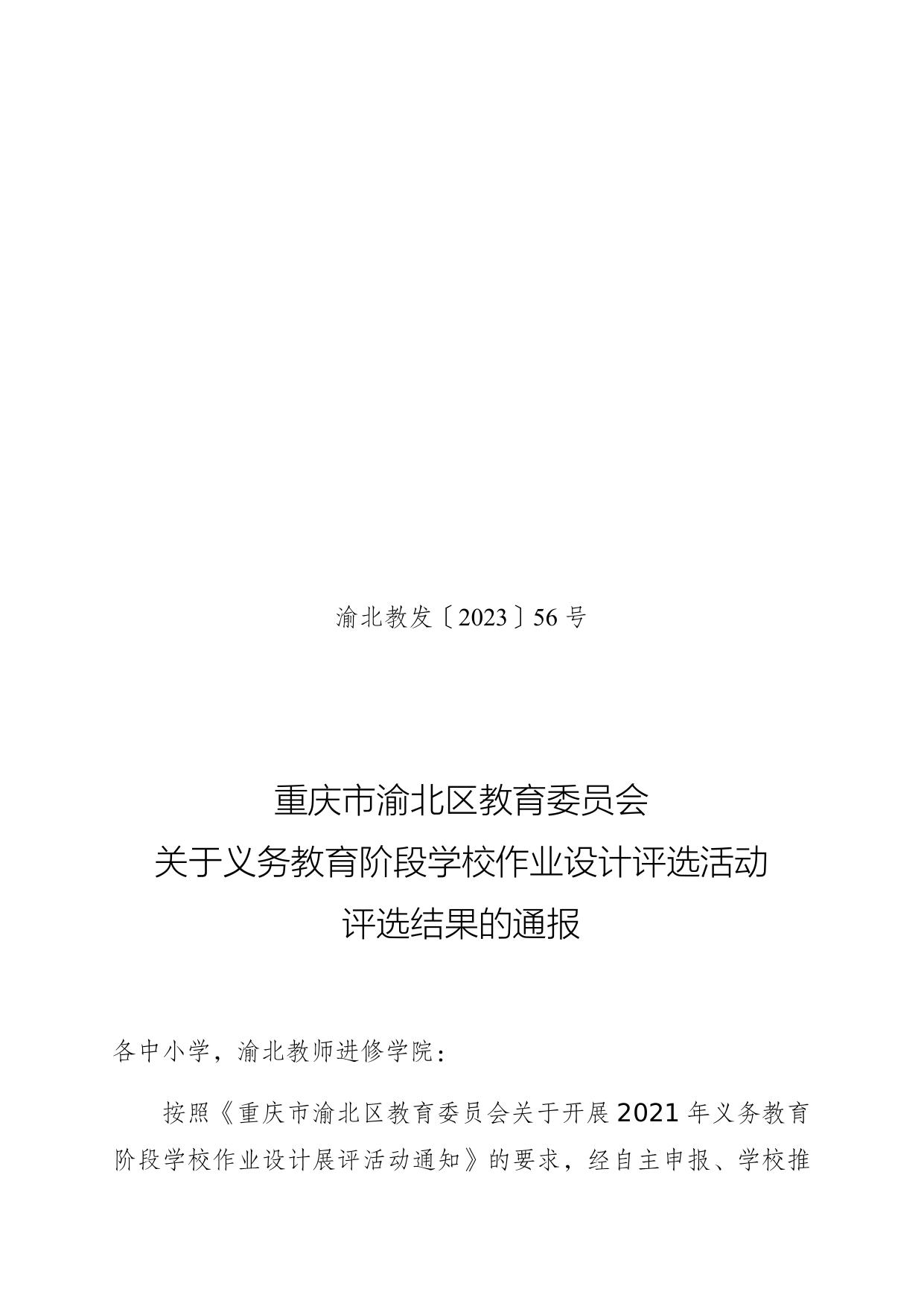渝北区教育委员会关于义务教育阶段学校作业设计评选活动评选结果的通报.docx