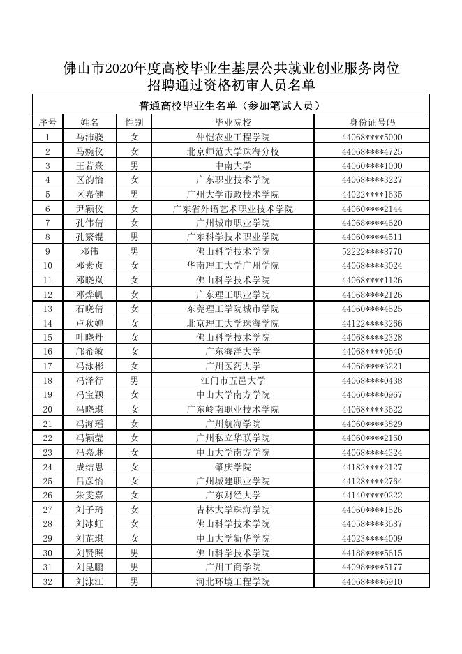 佛山市2020年度高校毕业生基层公共就业创业服务岗位招聘通过资格初审人员名单.pdf