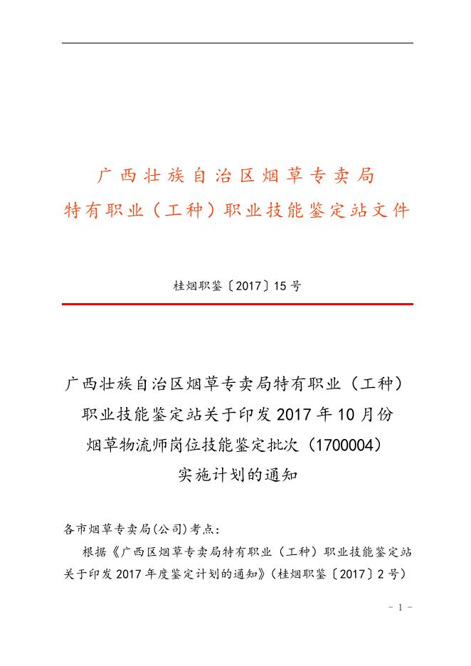 桂烟职鉴〔2017〕15号广西壮族自治区烟草专卖局特有职业(工种)职业技能鉴定站关于印发2017年10月份烟草物流师岗位技能鉴定批次(1700004)实施计划的通知.doc