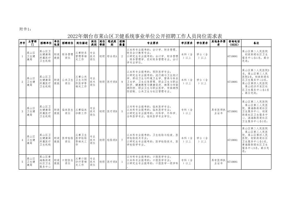 附件1:2022年烟台市莱山区卫健系统事业单位公开招聘工作人员岗位需求表.xls