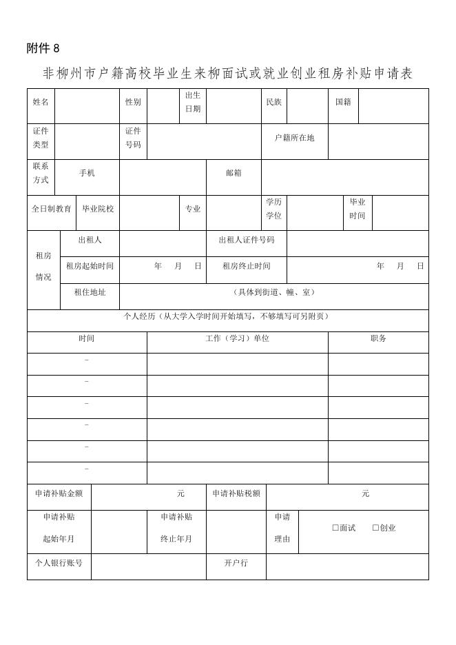 附件8:非柳州市户籍高校毕业生来柳面试或就业创业租房补贴申请表.docx