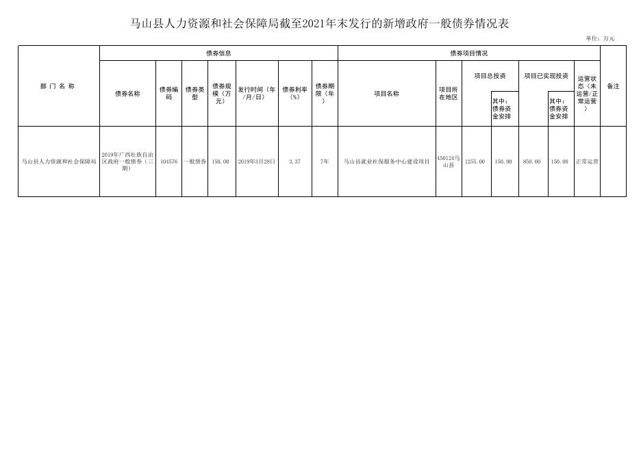 马山县人力资源和社会保障局截至2021年末发行的新增政府一般债券情况表 截至2021年末发行的新增政府一般债券情况表.xlsx
