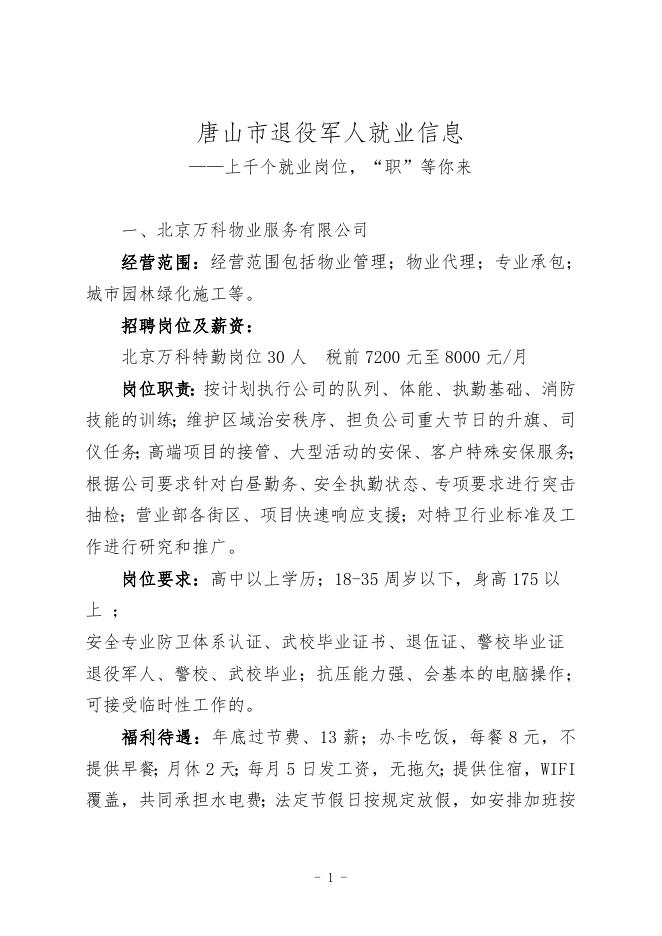 唐山市退役军人就业岗位信息.doc