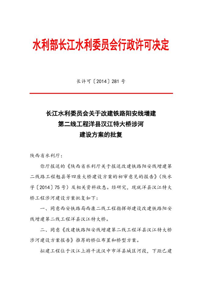 长江水利委员会关于改建铁路阳安线增建第二线工程洋县汉江特大桥涉河建设方案的批复.doc