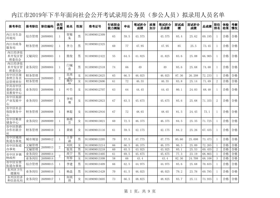 附件1:内江市2019年下半年面向社会公开考试录用公务员(参公人员)拟录用人员名单.xls