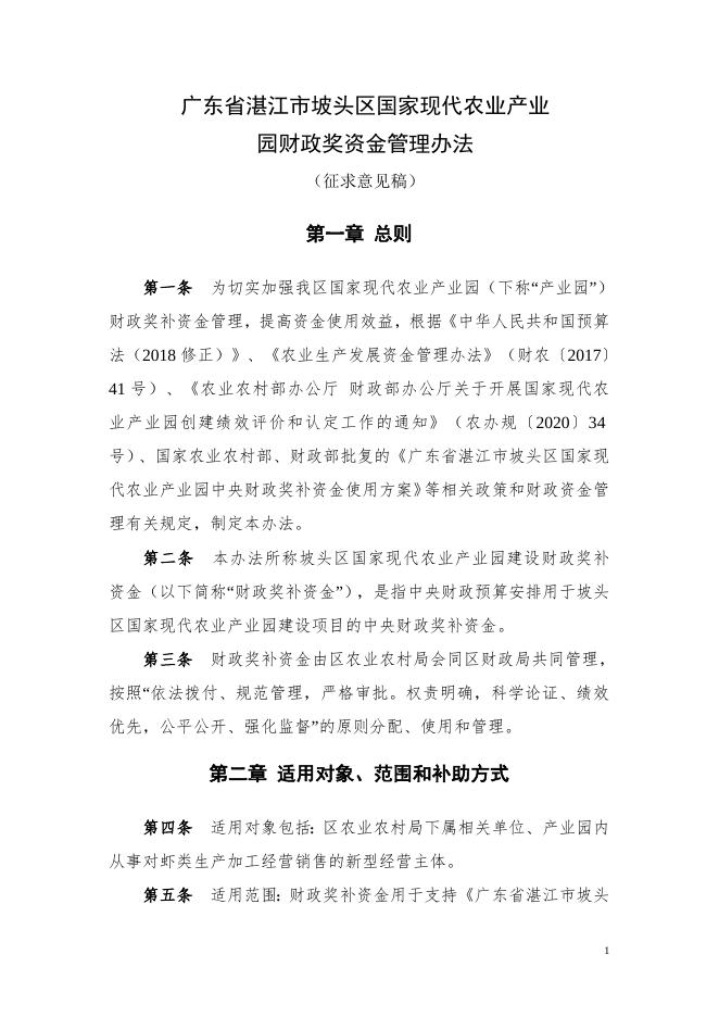 《广东省湛江市坡头区国家现代农业产业园财政奖补资金管理办法(征求意见稿)》.doc
