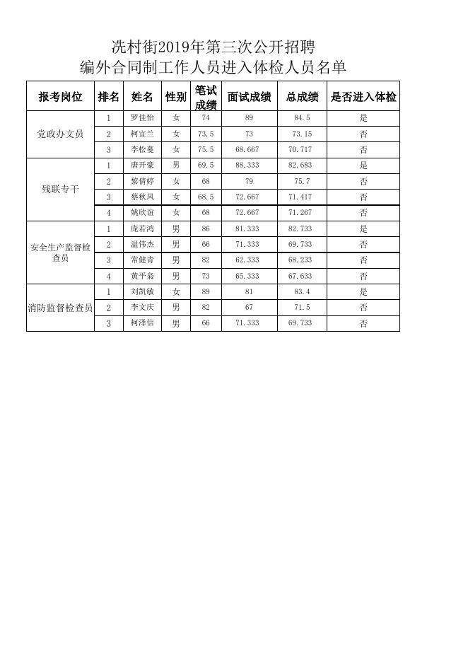 附件1:冼村街2019年第三次公开招聘编外合同制工作人员进入体检人员名单.xls