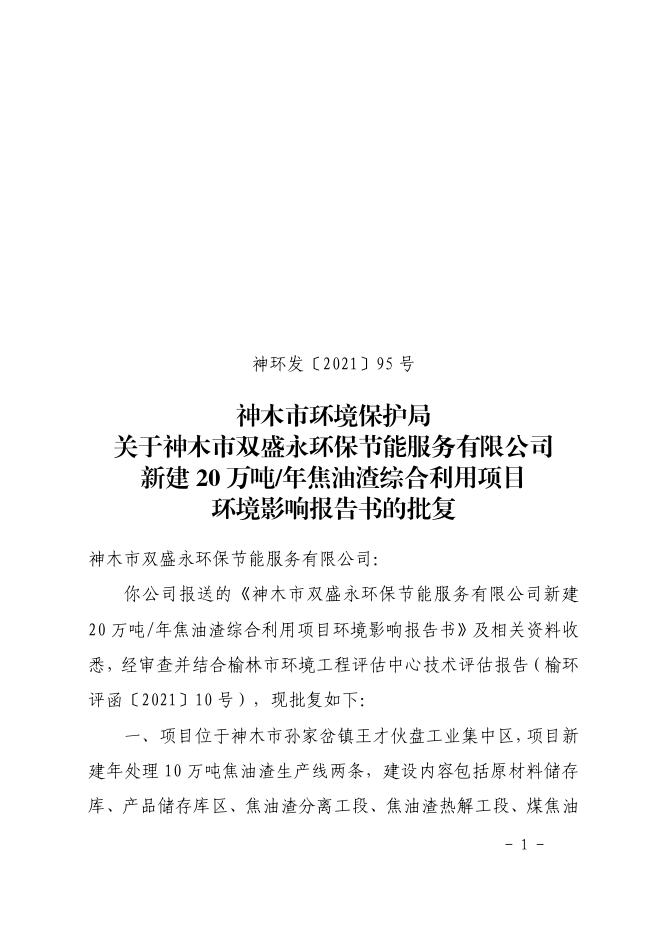 关于神木市双盛永环保节能服务有限公司新建20万吨年焦油渣综合利用项目环境影响报告书的批复.pdf