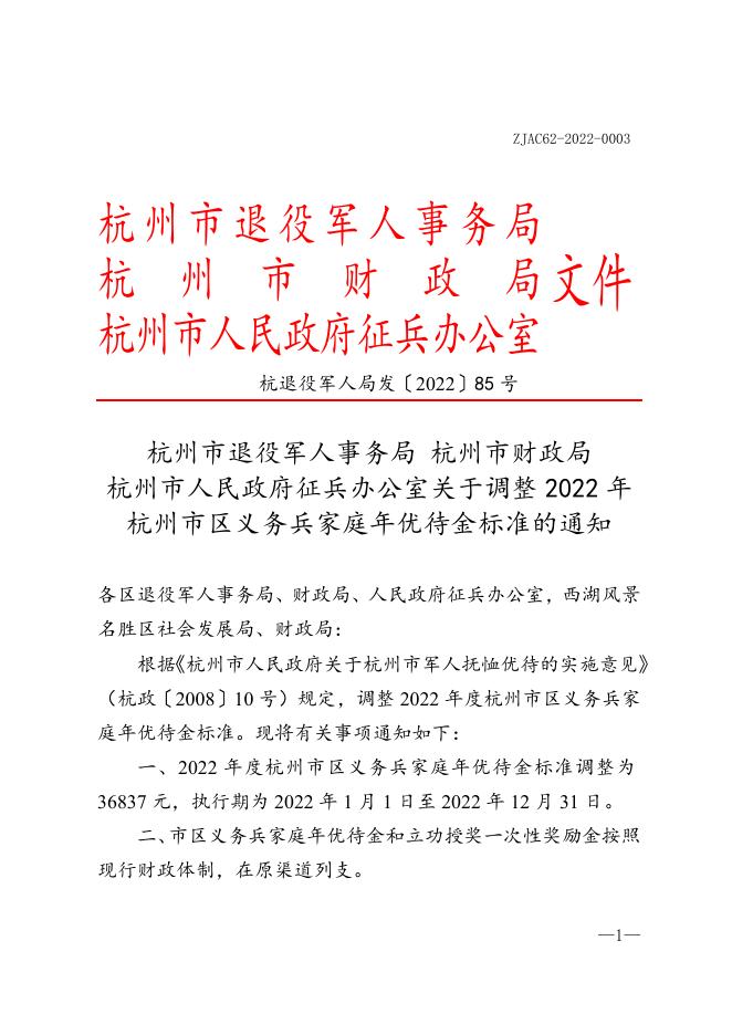 杭退役军人局发〔2022〕85号关于调整2022年杭州市区义务兵家庭年优待金标准的通知.doc
