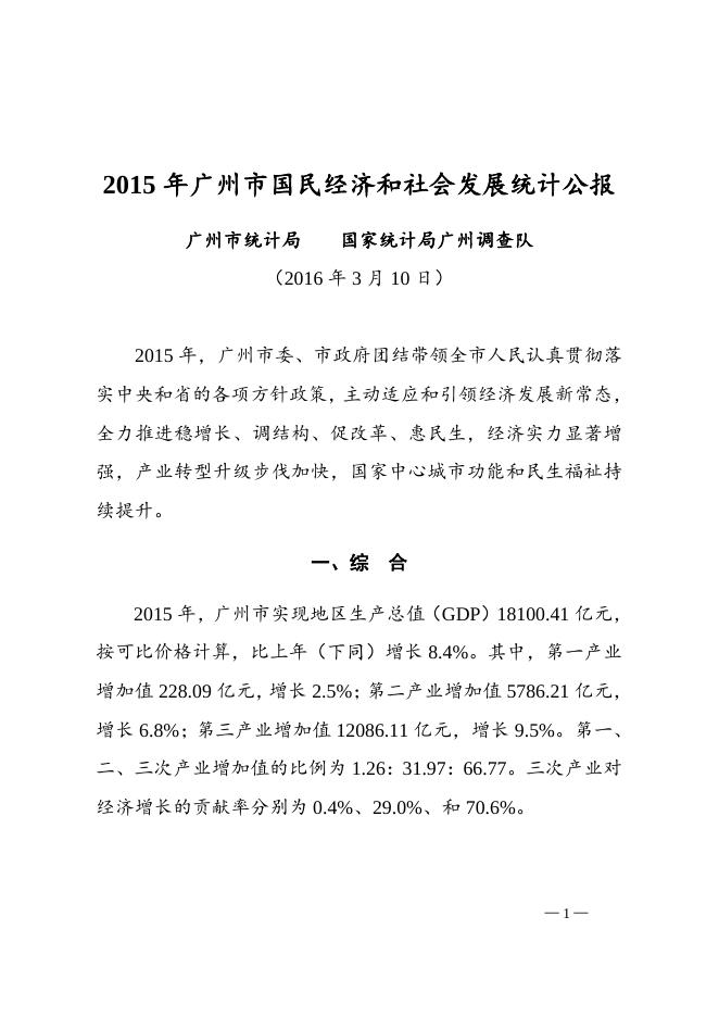 2015年广州市国民经济和社会发展统计公报.doc