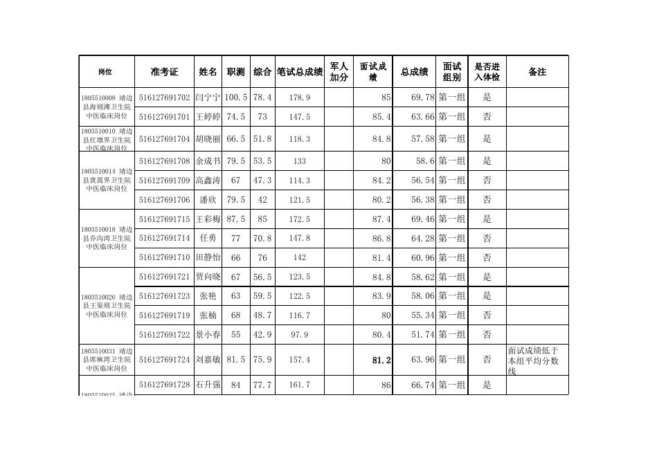 附:靖边县2018年事业单位公开招聘工作人员总成绩及进入体检人员名单.xls