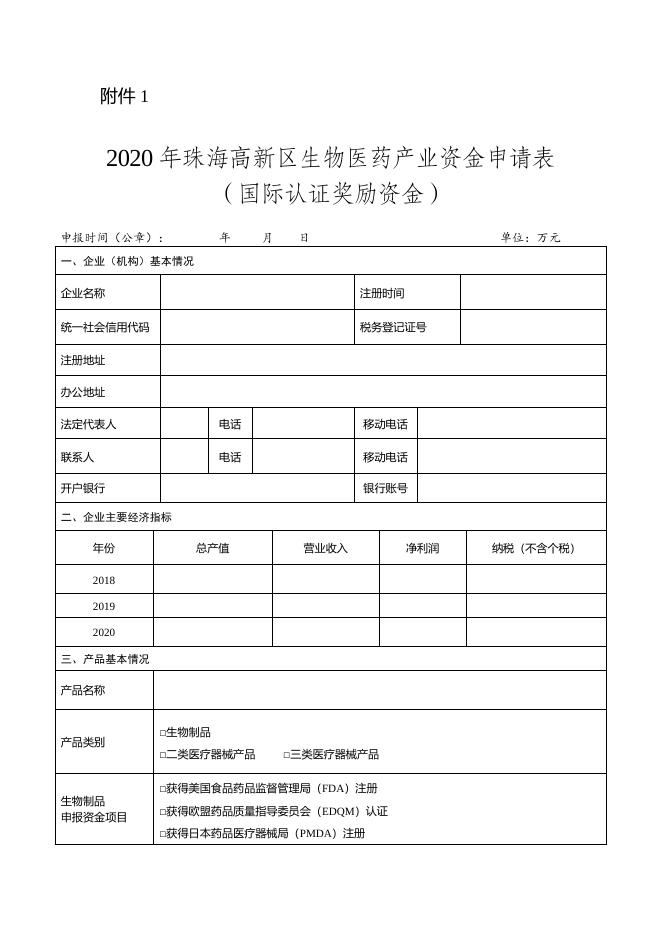 附件1:2020年度珠海高新区生物医药产业资金申请表(国际认证奖励资金).doc