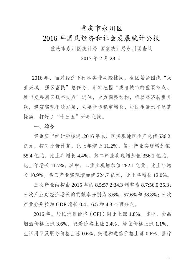 重庆市永川区2016年国民经济和社会发展统计公报.doc