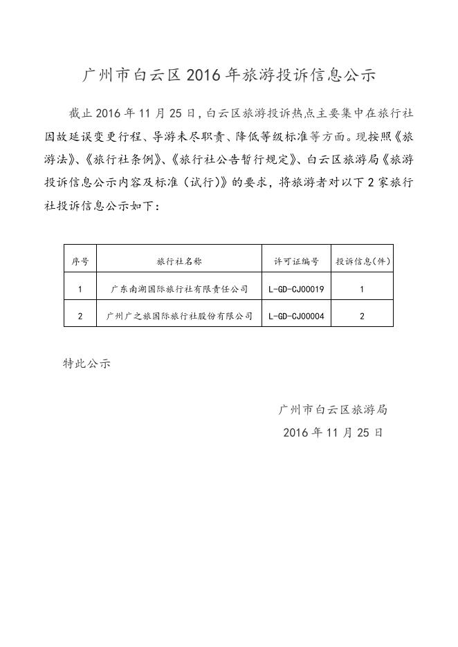 广州市白云区2016年旅游投诉信息公示.doc