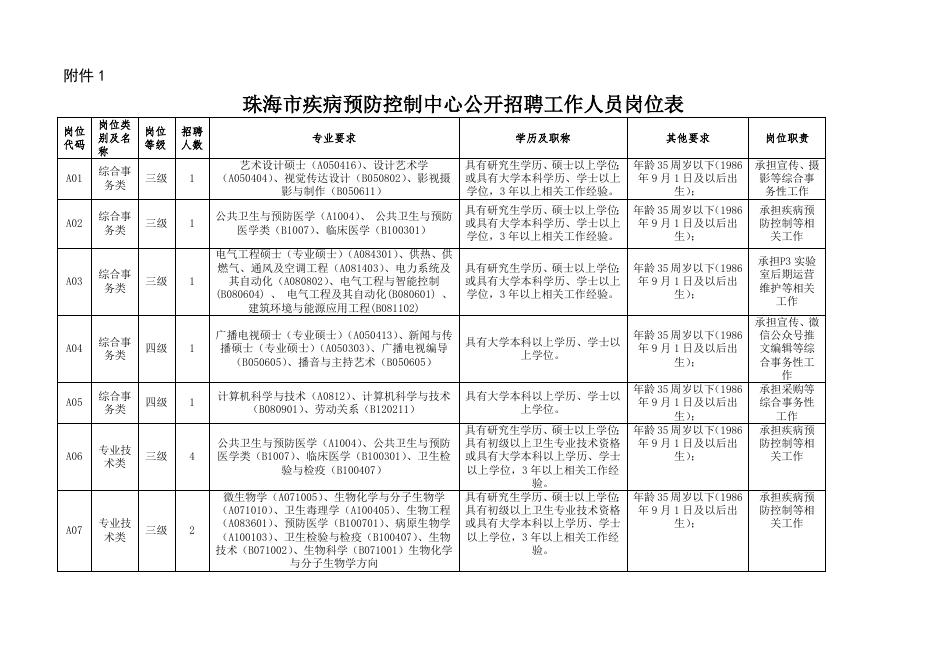 附件1:珠海市疾病预防控制中心公开招聘工作人员岗位表.docx